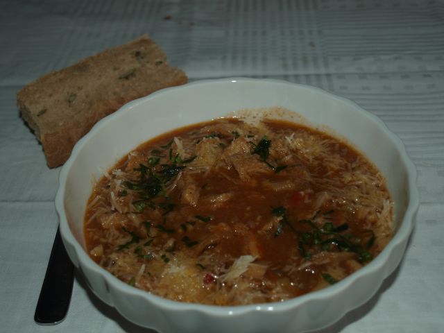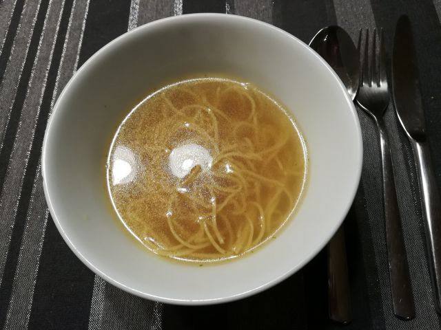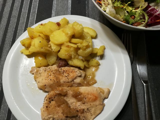 danes pa po dolgem času nedeljsko kosilo, piščančje-goveja juhica, na čebuli pečeni piščančji fileji, tenstan krompir in mešana solata