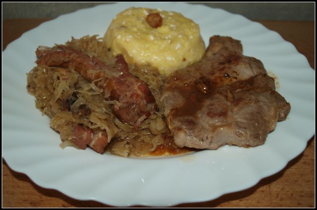 Dušeno kislo zelje, polenta s skuto in smetano, vratovina
