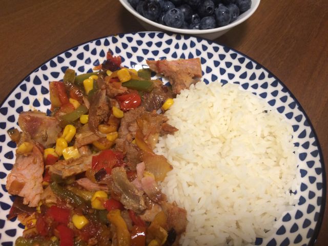 riz, puranje meso z zelenjavo(cebula, paradiznik,paprika, koruza) in borovnice
