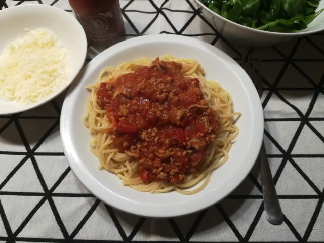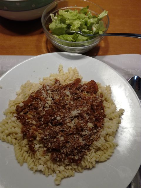 Danes mesna omaka, testenine, zelena solata