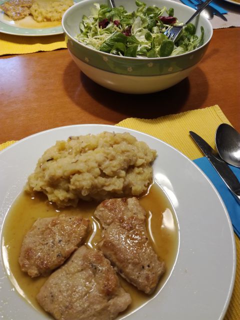 Danes goveja juha z rezanci, pražen krompir, zrezki v naravni omaki, mešana solata