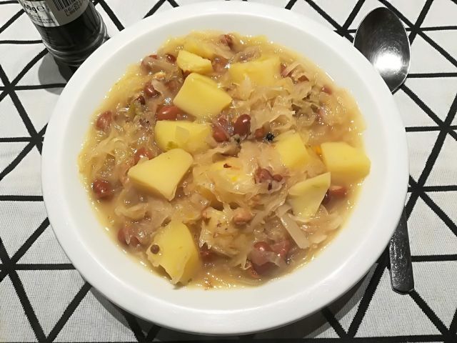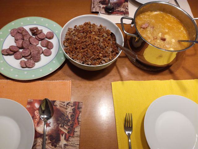 Danes jota, žganci, domača kranjska klobasa, kruh