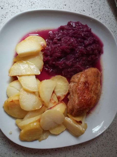 Danes file telečjega kareja, kosi piščanca, pečen krompir, rdeče zelje z jabolki, mešana solata