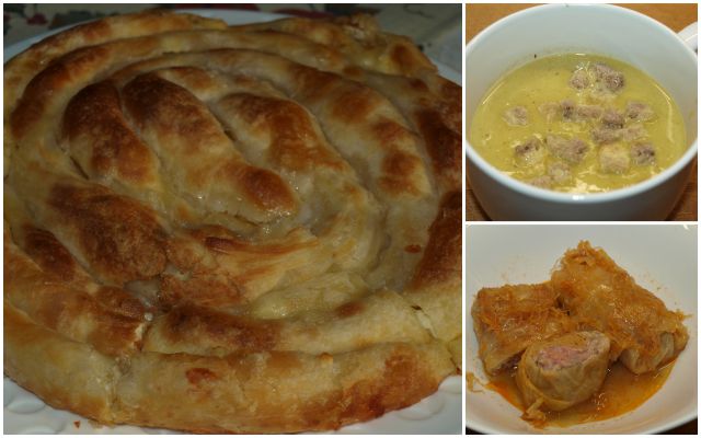 Gosta zelenjavna juhica s popečenim kruhom; sarma za pokušino (prinesla hči in zetko); sirna pita: