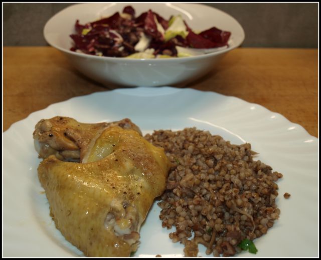 Piščančja juha s korenčkom in rezanci; ajdova kaša z jurčki, pečene perutničke; radič s fižolom: