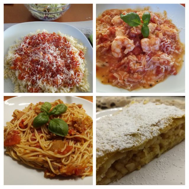 Danes testenine ( svedrčki, špageti, riževi rezanci), ratatuj omaka, paradižnikova, zame z dodatkom gamberov), zelena solata, korenček, navadno in rdeče zelje), jabolčni zavitek