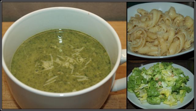 Kremna špinačna juhica s kosmiči; endivija s krompirjem in čičeriko, pašta na drobtinah, putru in parmezanu: