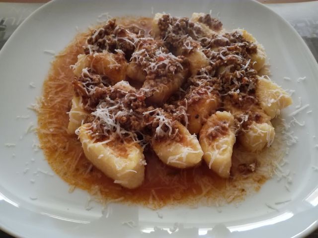 Včeraj skutno-bučni njoki z mesno polivko, mešana solata
