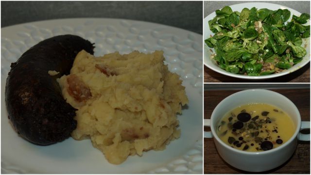 krvavice, matevž (krompir, čičerika) z ocirki; motovilec z lečo: