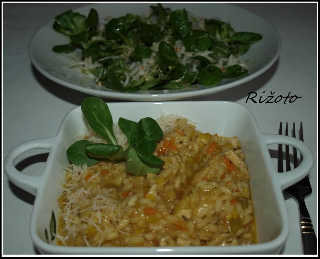 Rižoto (por, korenček, puranji trakci), motovilec s črno redkvico: