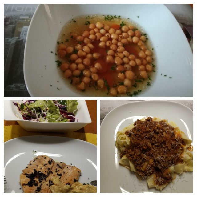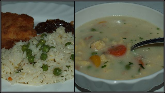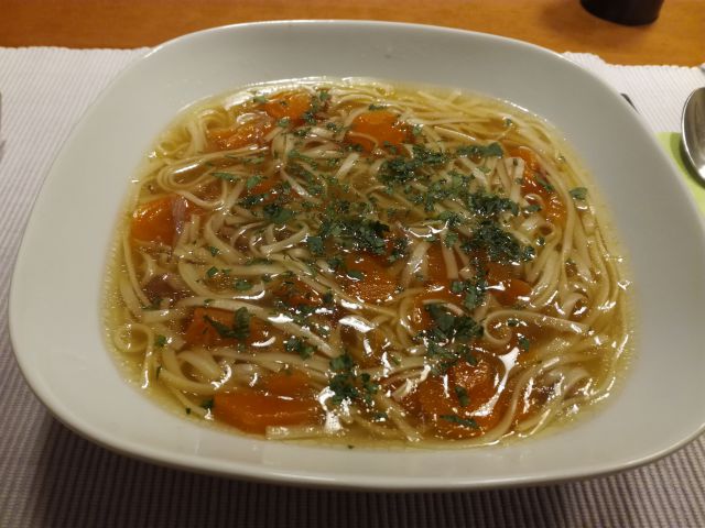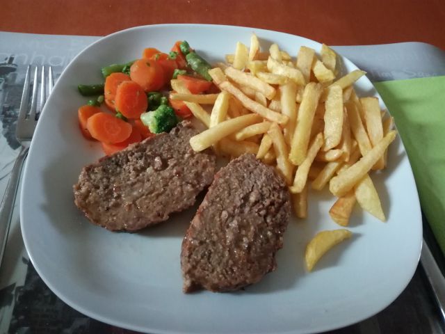 Včeraj za nekatere goveja juha z zlatimi kroglicami, preostanek mesne štruce, zelenjava, pomfri