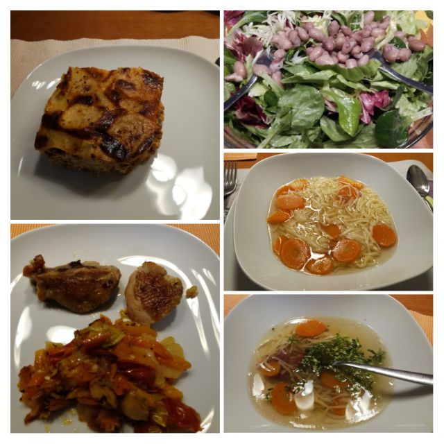 Danes goveja juha z rezanci, musaka od včeraj, zame kos piščanca z zelenjavo, mešana solata