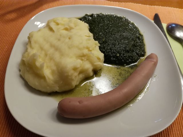 Predvčerajšnjim goveja juha z zdrobovimi cmoki, špinača, pire krompir, hrenovka, zelena solata