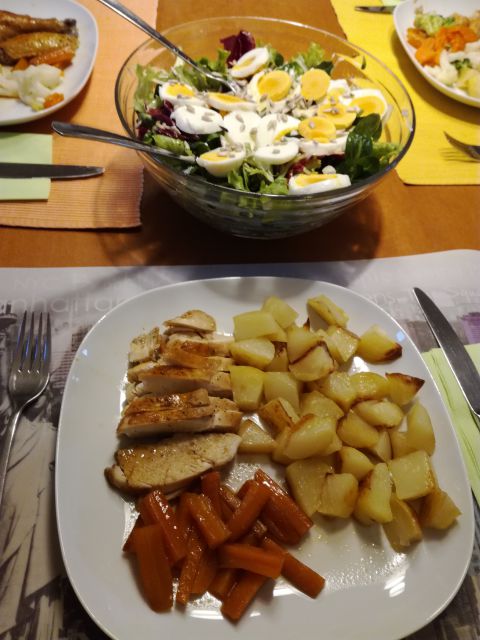 Včeraj pečeni piščančji kosi, kos sv.ribice, pečen krompir s korenjem, kuhana zelenjava, mešana solata z jajci