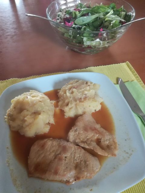 Danes pražen krompir, zrezki v naravni omaki, mešana solata