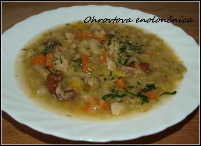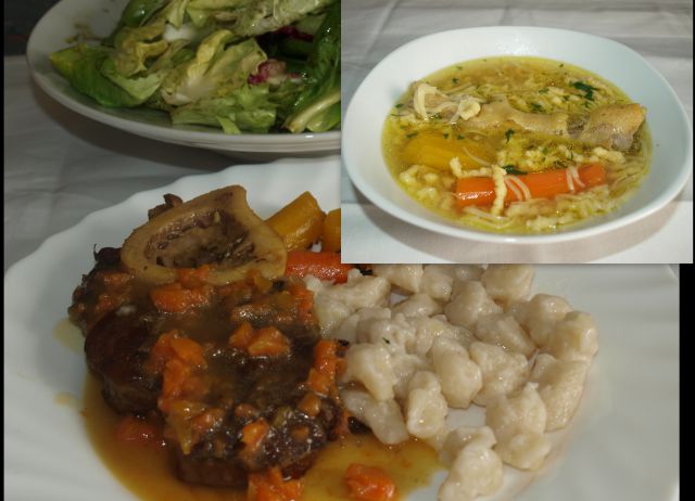 Kostno-piščančja juhica z zdrobovo ribano kašo; oso-buco z zelenjavo, ščipanci; radič