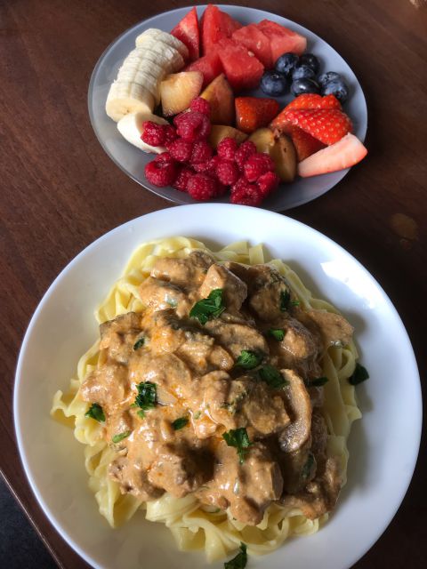 Testenine s piscancem in sampinjoni. Za sladico sadje
