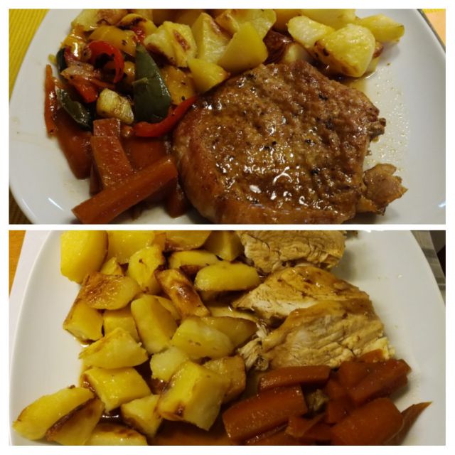 Včeraj pečen kos piščančjega mesa, svinjski kare, pečen krompir, dušena zelenjava, mešana solata