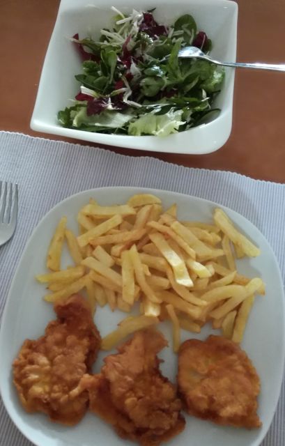 Danes za sina in hči pariški zrezki, krompirček, mešana solata ( regrat, motovilec, radič z vrta), zeljna solata
