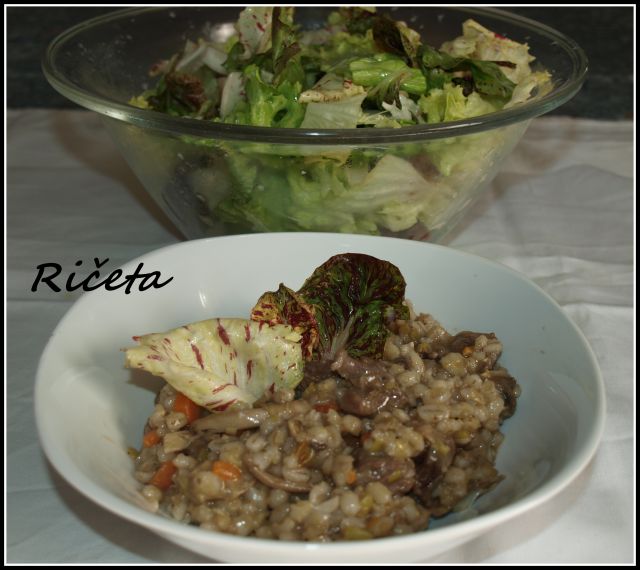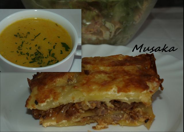 Porovo-korenčkova juhica z ribano kašo; musaka; radič, zelje in krompir: