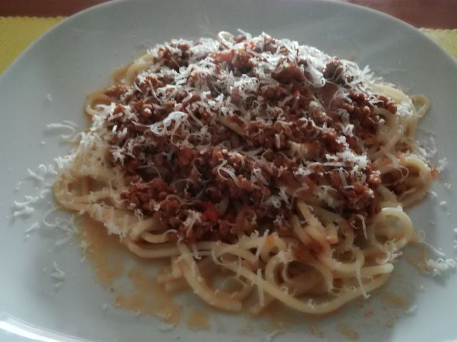 Včeraj testenine bolognese, zelena solata.