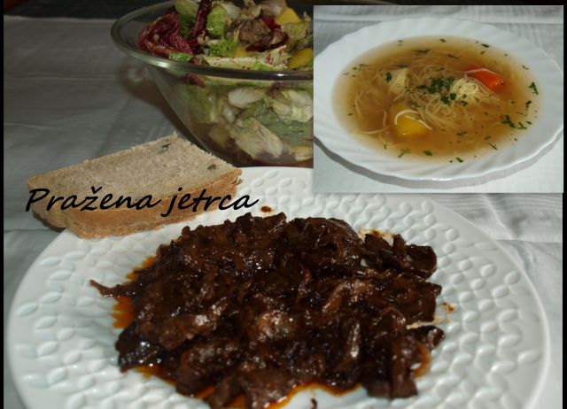 Goveja juhica (zaloga); pražena jetrca, domač kruh, radič z govedino iz juhe, krompir