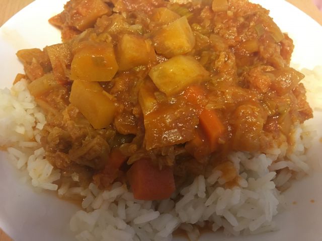riz, zelenjavna omaka in slonov krof