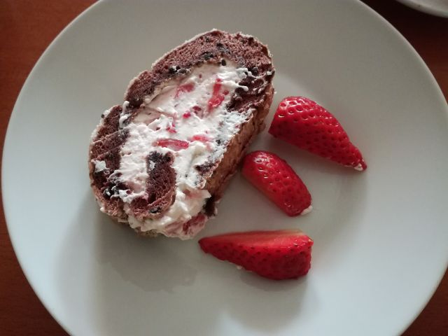 Za sladico čokoladno beljakova rolada z nadevom iz mascarpone- smetane, jagode...