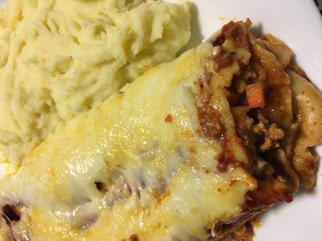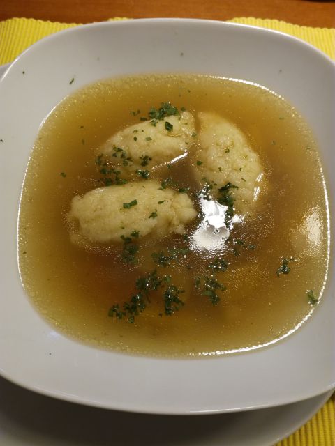 Pri nas danes kostna juha z zdrobovimi knedli, musaka, motovilec s fižolom in buhtelnji. Njami je bilo.
