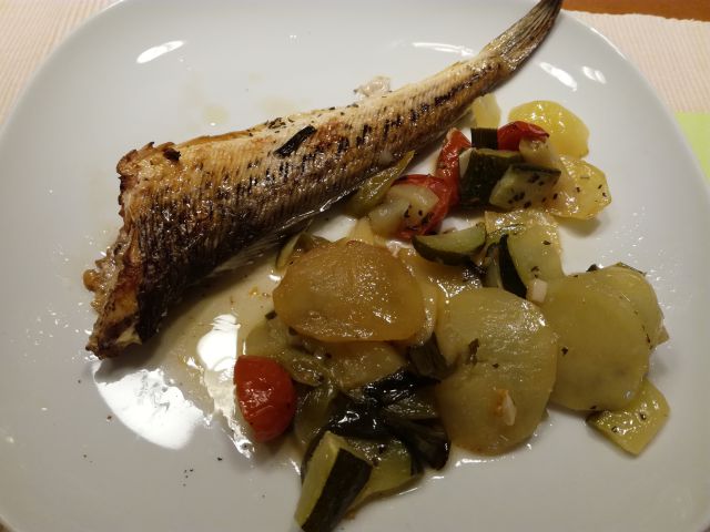 Goveja juha z zdrobovimi cmoki, ostanek musake, zame morski vrag s prilogo, regrat s krompirjem, rolada od včeraj.