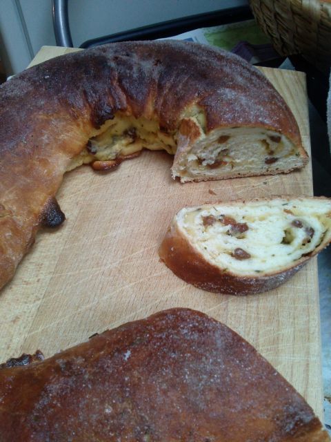 Goveja juha, meso iz juhe, pražen krompir in solata. Za posladek rozinova rolica.