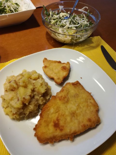Danes meso po dunajsko, zame ( naravno pečen zrezek), pražen krompir, mešana solata( regrat, domač motovilec, zelje)