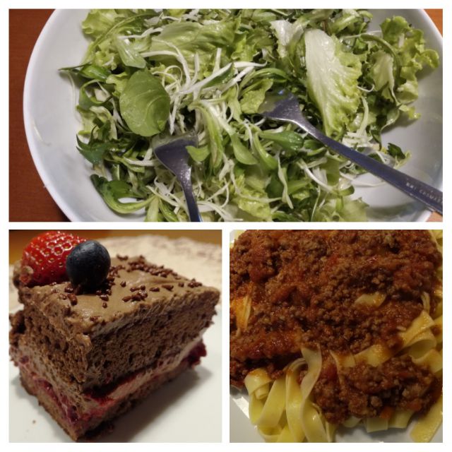 Danes široki rezanci, bolognese omaka, mešana solata, čokoladna tortica z malinami in jagodami