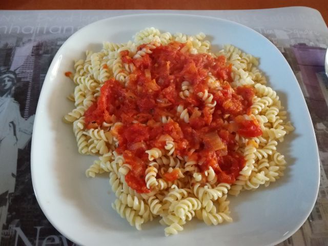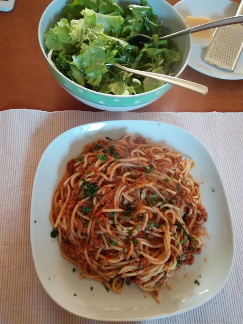 Danes špageti bolognese, paradižnikova omaka s svedrčki, zame z riževimi rezanci, mešana solata