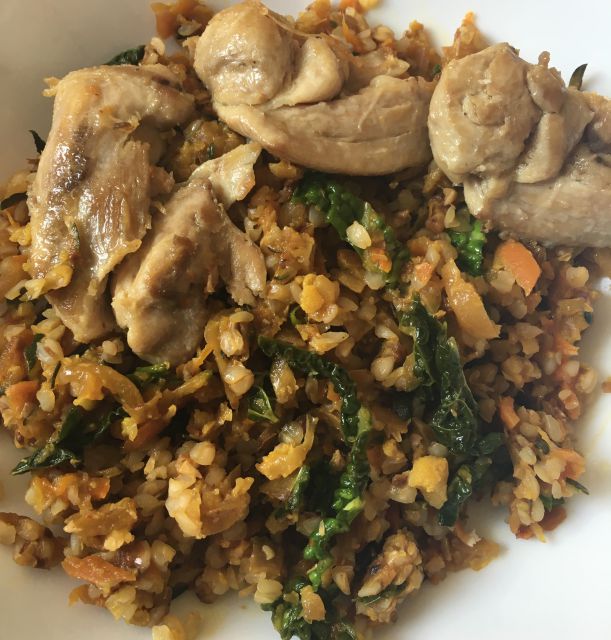 ajdova kasa z zelenjavo (cebula, cvetaca, korencek, ohrovt, paprika in bucka) in piscanec.