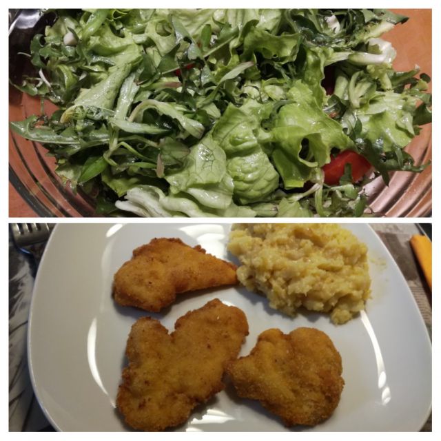 Včeraj meso po dunajsko ( svinjina, perutnina) pražen krompir, mešana solata