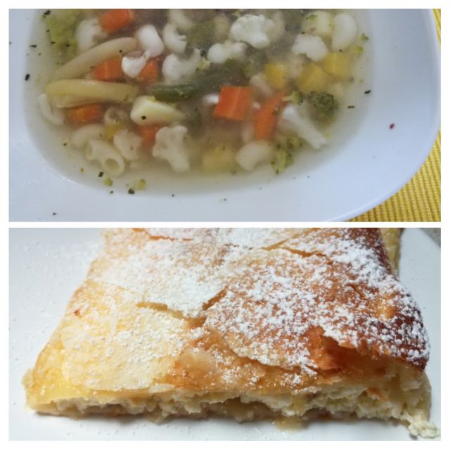 Mesno- zelenjavna juha, kruh, skutin zavitek z rozinami
