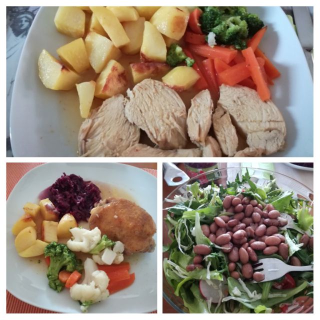 Danes pečene piščančje prsi, del bedre, sv.kotlet, rdeče zelje z jabolki, pečen krompir, zelenjava, mešana solata