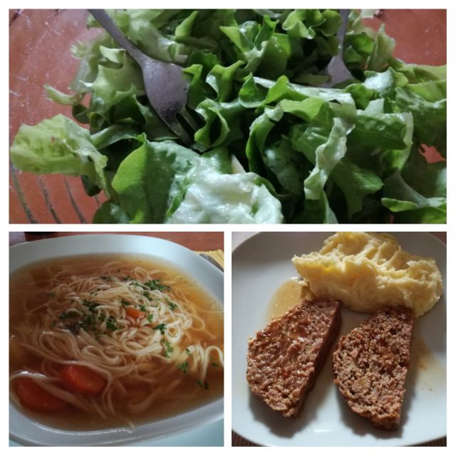 Goveja juha z rezanci, mesna štruca, pire krompir, zelena solata