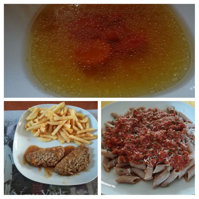 Danes goveja juha- za enega z rezanci, za druge brez, pirine testenine z bolonjsko omako, za enega preostanek stefani pečenke, pomfri, zelena solata