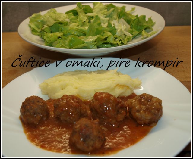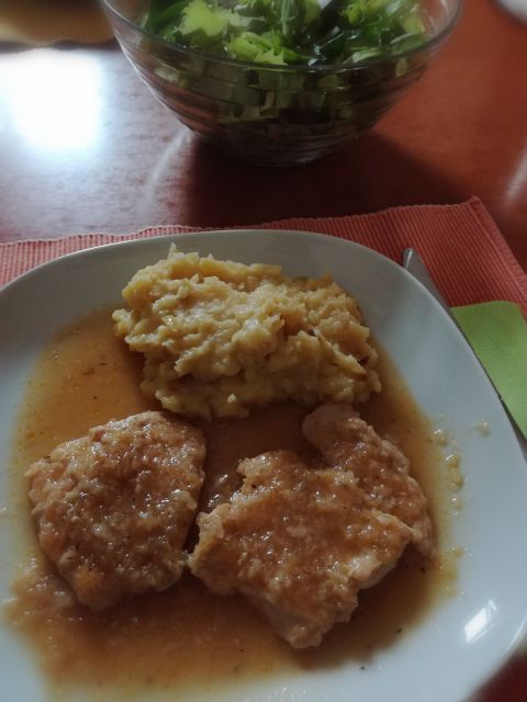 Danes zrezki v omaki, pražen krompir, mešana solata