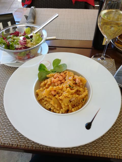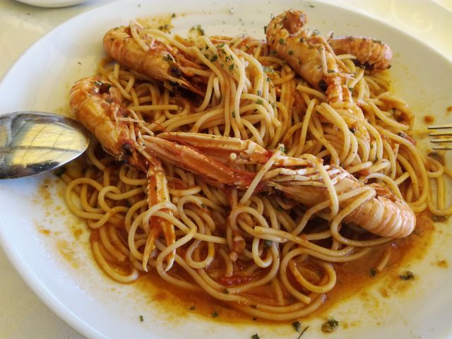 Predvčerajšnjim smo veliko hodili in je bila hrana po vetru zelo zaželjena,jedli smo fuže z beluši, pečen file piščančjih prsi, file ribe. Včeraj smo malo pojedli spotoma ob dolgemu sprehodu.. Danes za moja dva pizza, zame škampi. Spet je bila dolga, dolga hoja...