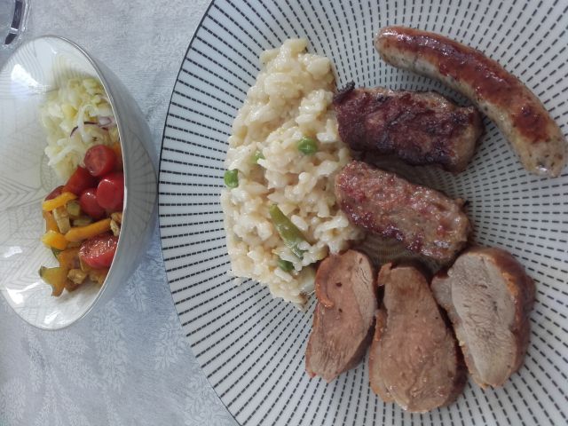 Bučna juhica, porova rižota, račja prsa, čevapčiči, mešana solata: