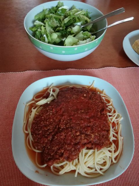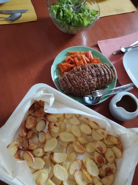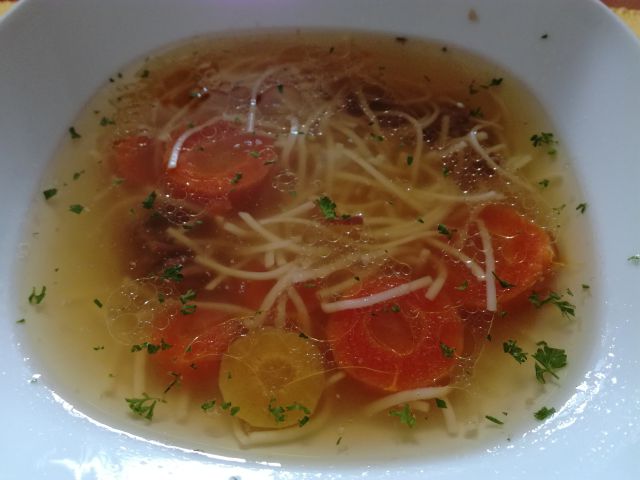 Včeraj goveja juha z rezanci, mesna štruca, pečeno korenje, pečen krompir, berivka in zeljna solata.