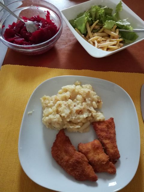 Danes meso po dunajsko, pražen krompir, stročji fižol v solati, rdeča pesa