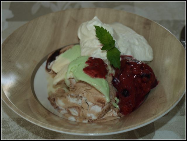 Enolončnica s sladkim zeljem; sladoled, gozdni sadeži, smetana