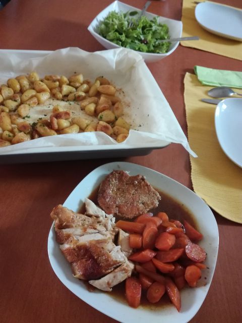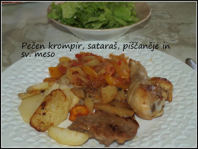 Včeraj goveja juha z rezanci, pečen mlad krompir, pečena prsa, sv. kare, pečen korenček, berivka