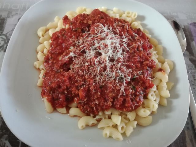 Danes testenine, mesna omaka, zelena solata.