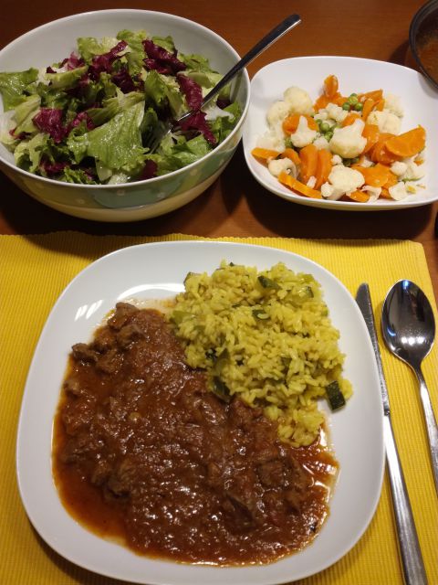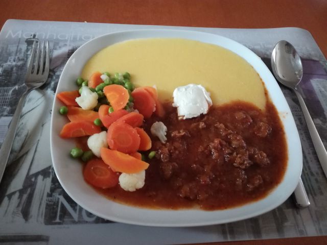 Predvčerajšnjim telečji trakci v omaki, polenta, zelenjava, zelena solata z radičem