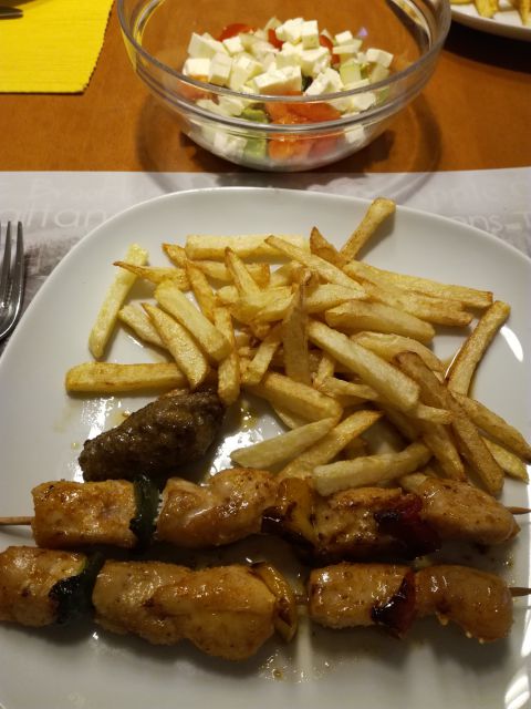 Včeraj nabodala, domača pleskavica, pomfri, šobska solata